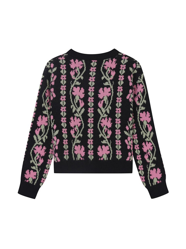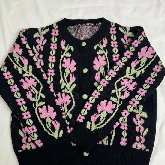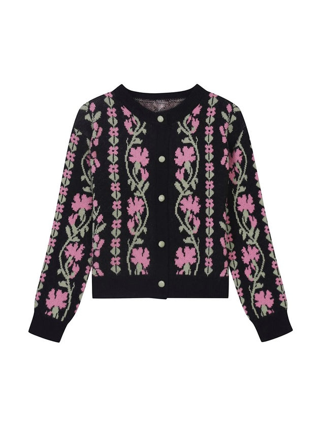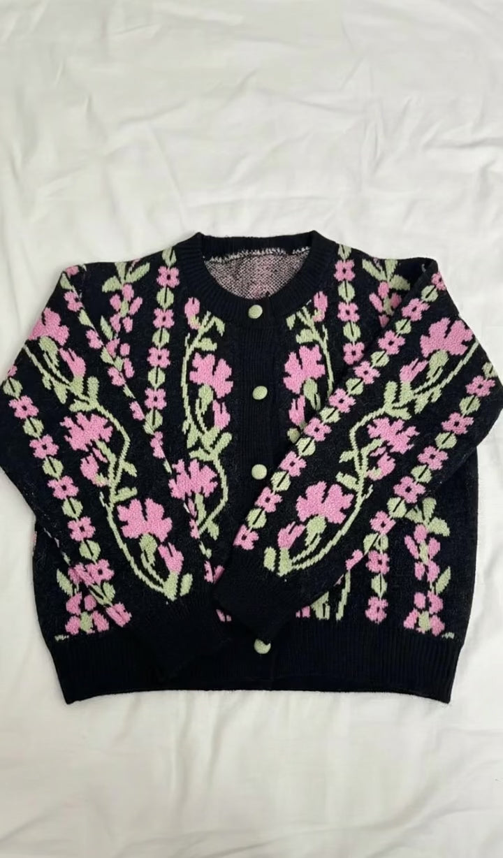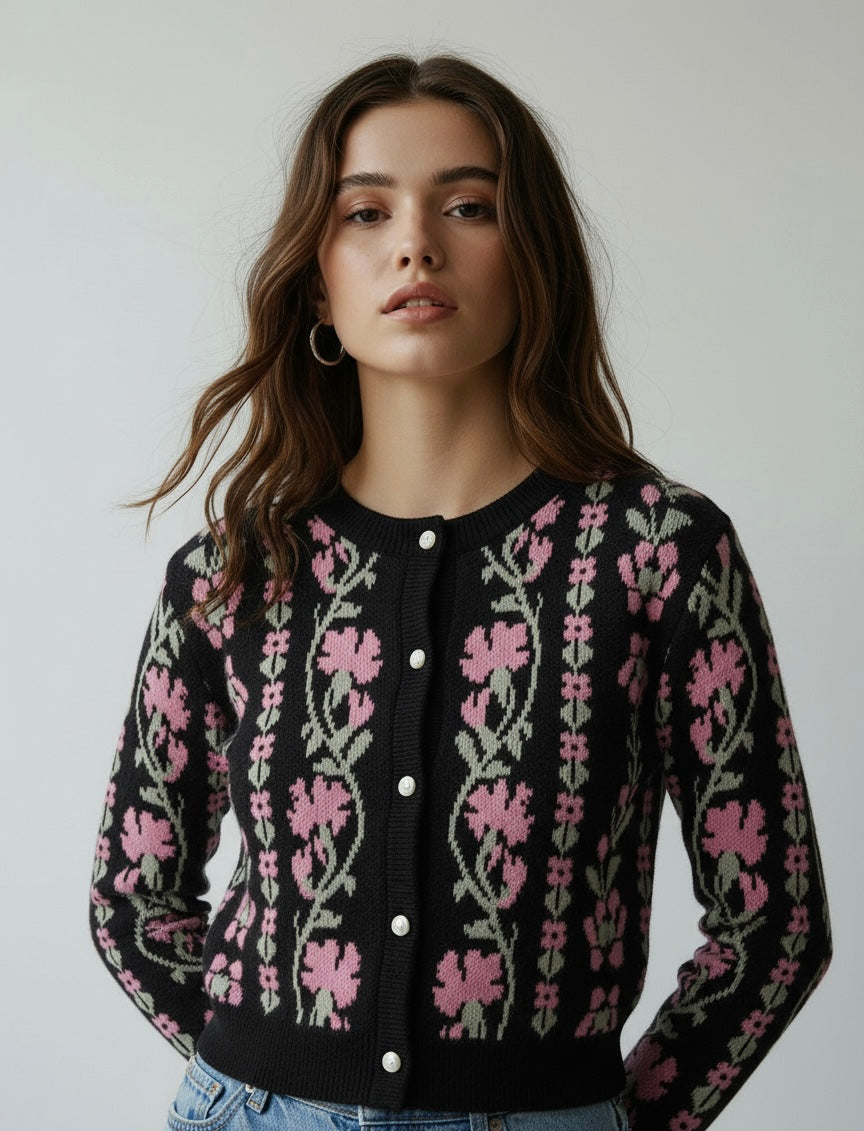 Loose Fit Short Printed Cardigan. Button-Though Opening Along With pattern all over , Sleeve Hem And Body Hem